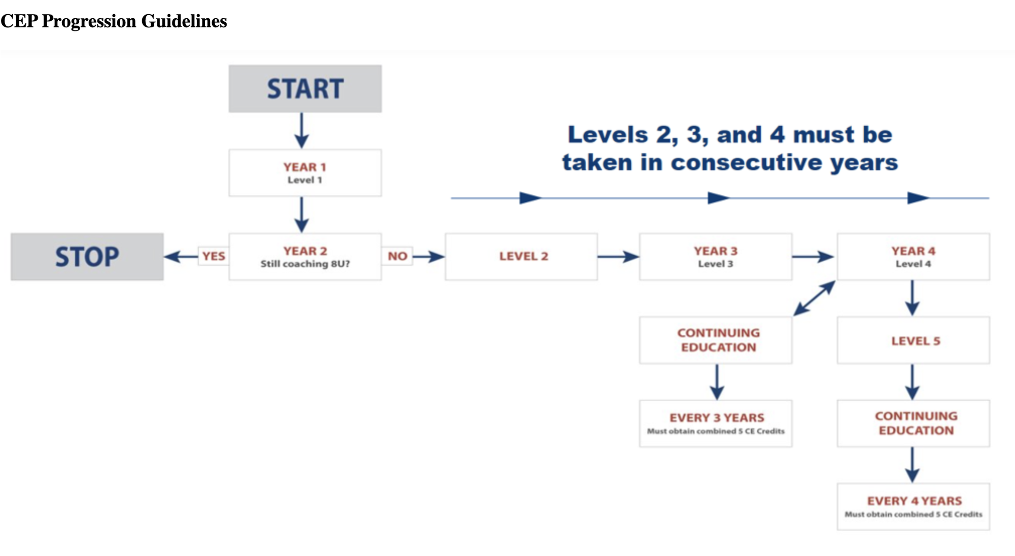 NEW Grandfather Clause - *For coaches who received Level 4 or Level 5 PRIOR TO January 1, 2021, your certification is still valid indefinitely (the 3-year change does not apply). Coaches with CEP 4 or 5 who coach Tier I and Tier II teams will be required to do continuing education every three years moving forward.
